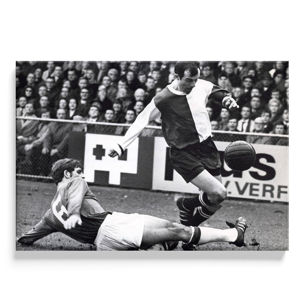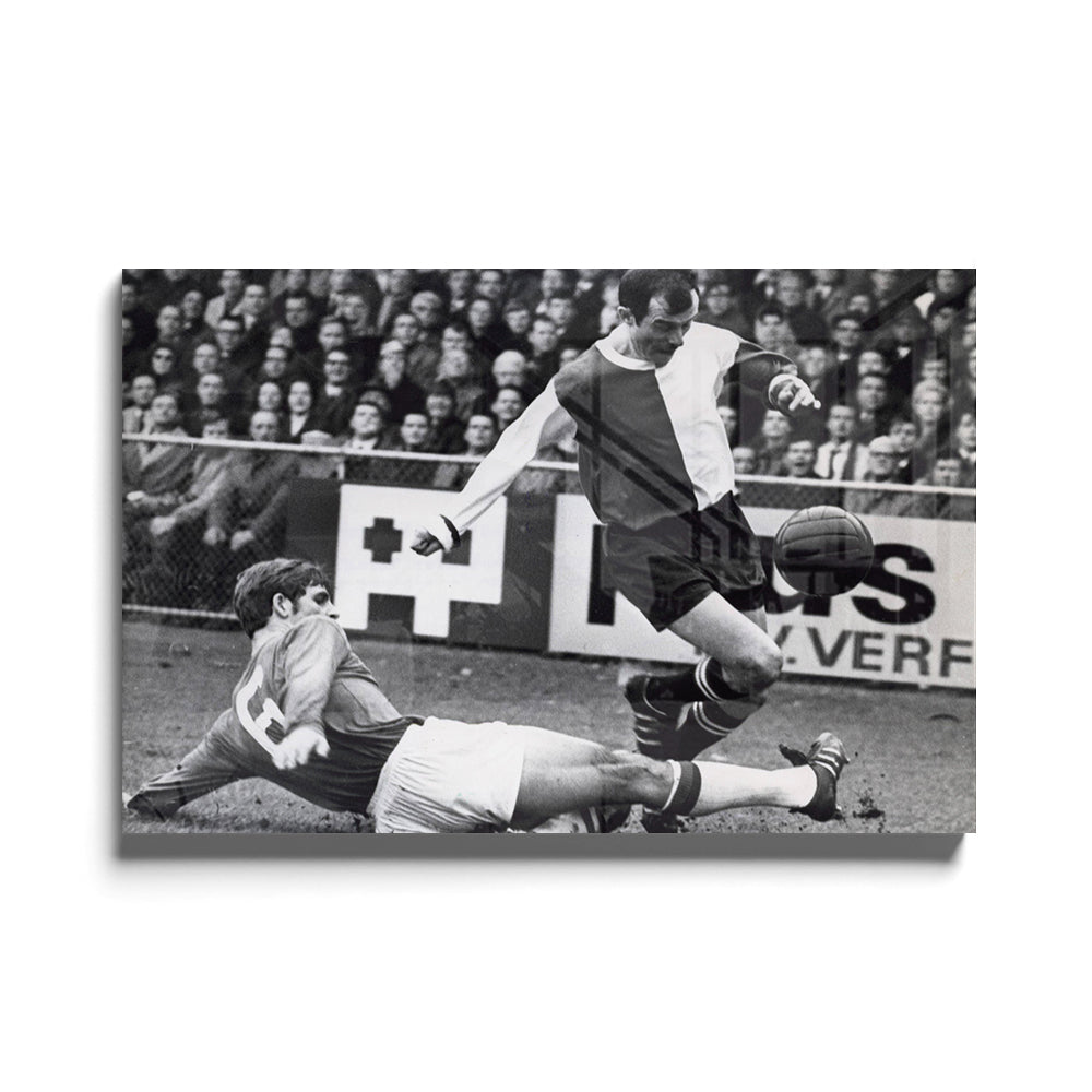 Experience the magic of classic Dutch football with this black-and-white poster of Coen Moulijn in action during the 1969 Feyenoord-AZ match. Moulijn, the legend of the South, is captured in the moment he dodges a tackle with the ball at his feet. The crowd in the background watches intently. A powerful tribute to one of the greatest Feyenoord players of all time.