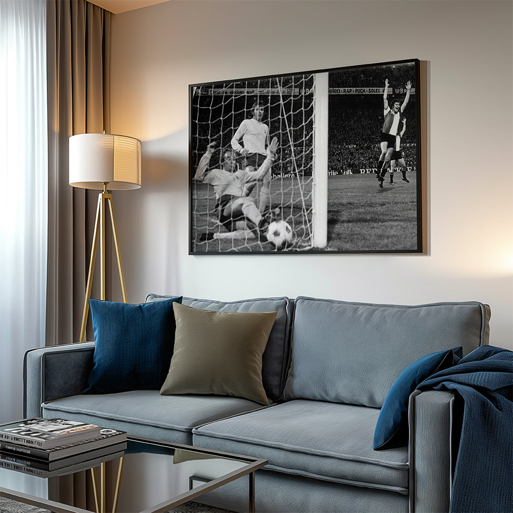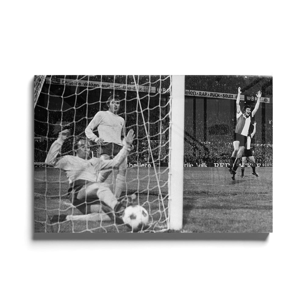 Experience the historic moment when Feyenoord scored against Tottenham Hotspur in the 1974 UEFA Cup final. This black-and-white poster shows the ball just over the goal line, the England goalkeeper beaten to the ground, and a Feyenoord player celebrating with both arms raised. An iconic image from one of the greatest triumphs in the club's history, captured at De Kuip stadium.
