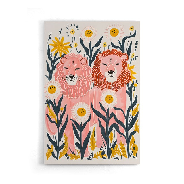 Bring a playful and cheerful atmosphere into your home with this colorful poster of two pink lions among wildflowers and daisies. The unique, illustrative design combines bold animals with soft colors and fits perfectly into a modern, creative interior. Printed on 250-gram premium satin paper for a luxurious look and vibrant details – ideal as a focal point for any wall.