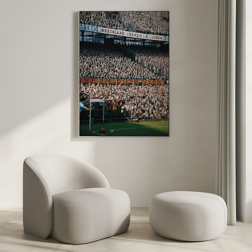 This unique color poster from the 1950s and 1960s offers a rare glimpse into De Kuip stadium, packed with Feyenoord supporters. At the moment of a corner kick, the tension is palpable: thousands of spectators stand packed along the pitch, clad in jackets and caps, staring at the ball. The colorful advertising hoardings and vintage stands make this image a timeless tribute to the Rotterdam football experience of the past.