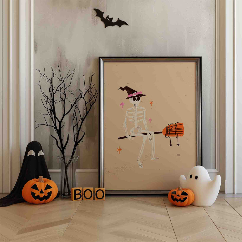 De poster toont een luchtig skelet met een heksenhoed, zittend op een bezemsteel, tegen een warme beige achtergrond met kleurrijke steraccenten. Perfect voor wie van Halloween houdt, maar ook van een knipoog in zijn interieur.
