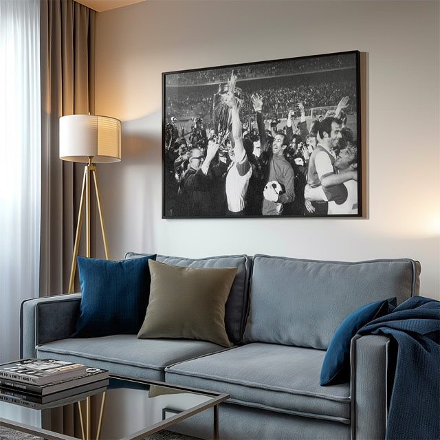 Deze legendarische zwart-wit poster toont het moment waarop Feyenoord als eerste Nederlandse club de Europa Cup I wint in 1970. Tussen juichende spelers, pers en supporters wordt de enorme beker triomfantelijk omhooggehouden. De gezichten van blijdschap, trots en ongeloof spreken boekdelen. Een onvergetelijke avond in Milaan, vereeuwigd op één krachtig beeld.