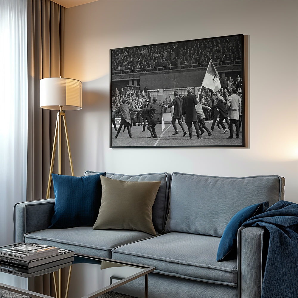 Een zeldzaam en rauw beeld uit 1965: Feyenoord-supporters stormen juichend het veld op tijdens de beladen klassieker tegen Ajax. Met grote rood-wit-zwarte vlag vieren jonge fans de overwinning of het eindsignaal in een ongecontroleerde explosie van vreugde. Een iconisch zwart-wit foto die perfect de passie en emotie van de Klassieker weergeeft, midden in De Kuip.