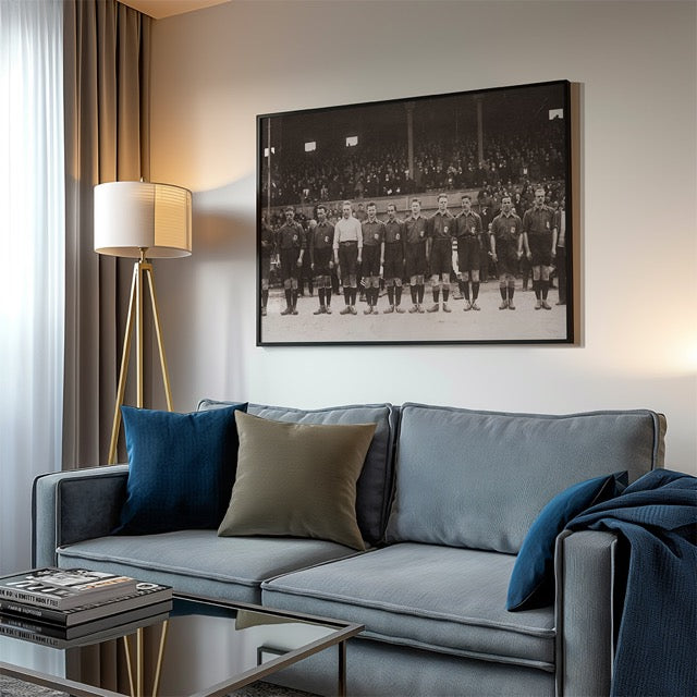 Deze unieke zwart-wit poster toont het Nederlands Elftal voorafgaand aan de interland tegen Denemarken in 1922, waarin Oranje met 2-0 won. In klassieke tenues poseren de spelers trots voor de camera.