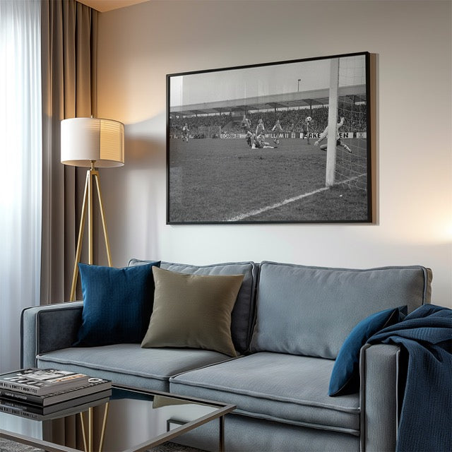 Deze zwart-wit poster legt het moment vast waarop Johan Zuidema scoort voor FC Twente in de uitwedstrijd tegen FC Twente in 1974. Een krachtig beeld van actie, precisie en FC Twente-historie, recht uit het hart van de Eredivisie.