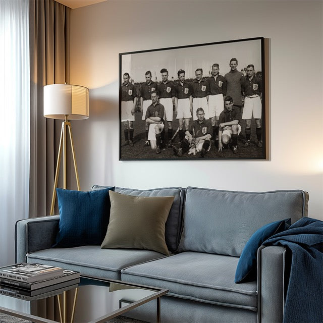 Deze unieke zwart-wit poster toont het Nederlands Elftal voorafgaand aan de interland tegen België in 1927, waarin Oranje met 2-0 won. In klassieke tenues poseren de spelers trots voor de camera.