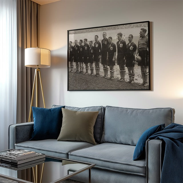Deze unieke zwart-wit poster toont het Nederlands Elftal voorafgaand aan de interland tegen Ierland in 1932, waarin Oranje met 0-2 verloor. In klassieke tenues poseren de spelers trots voor de camera.