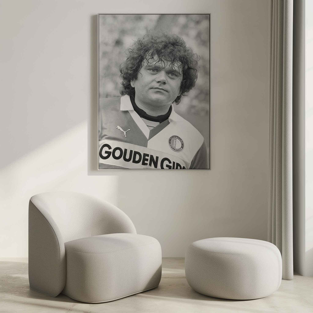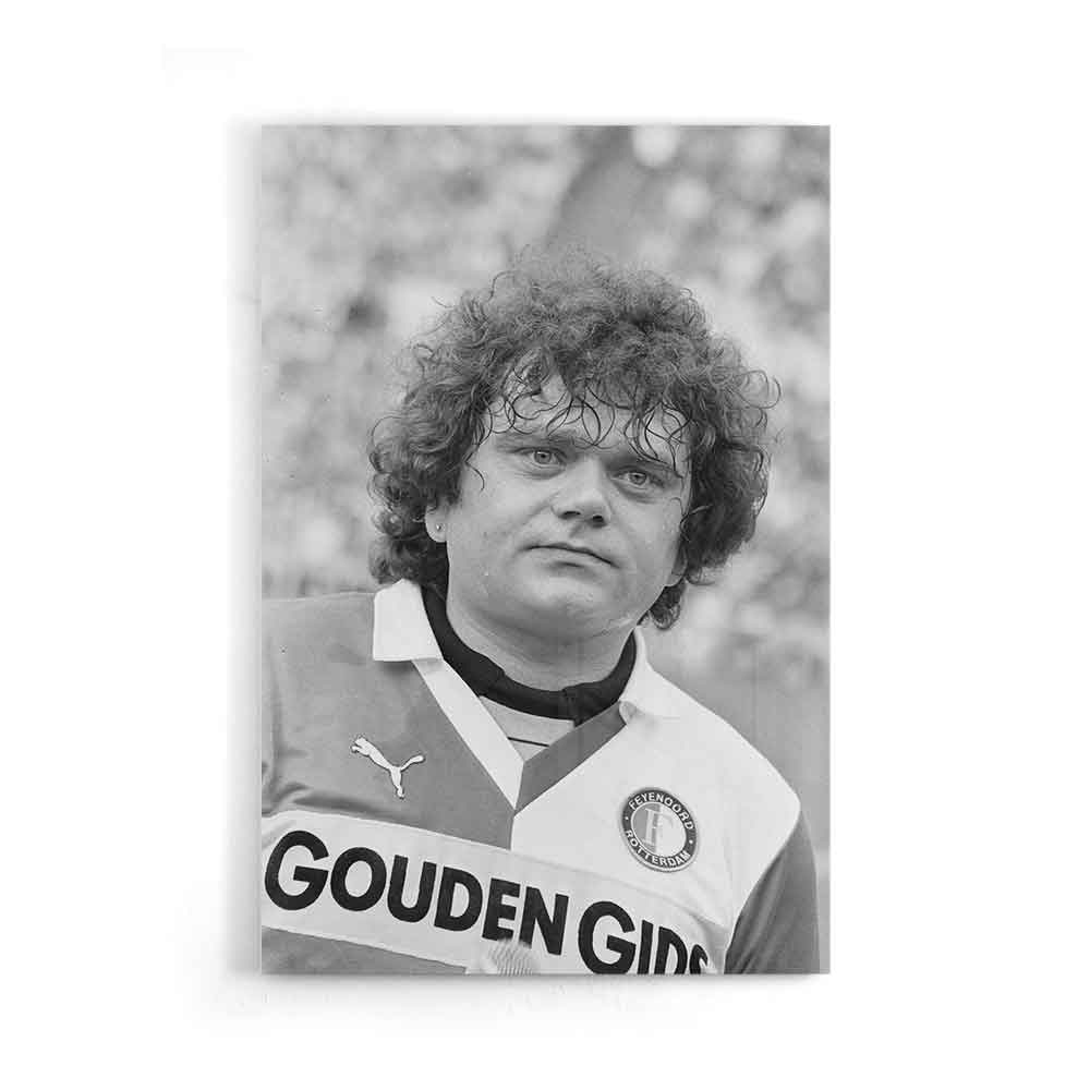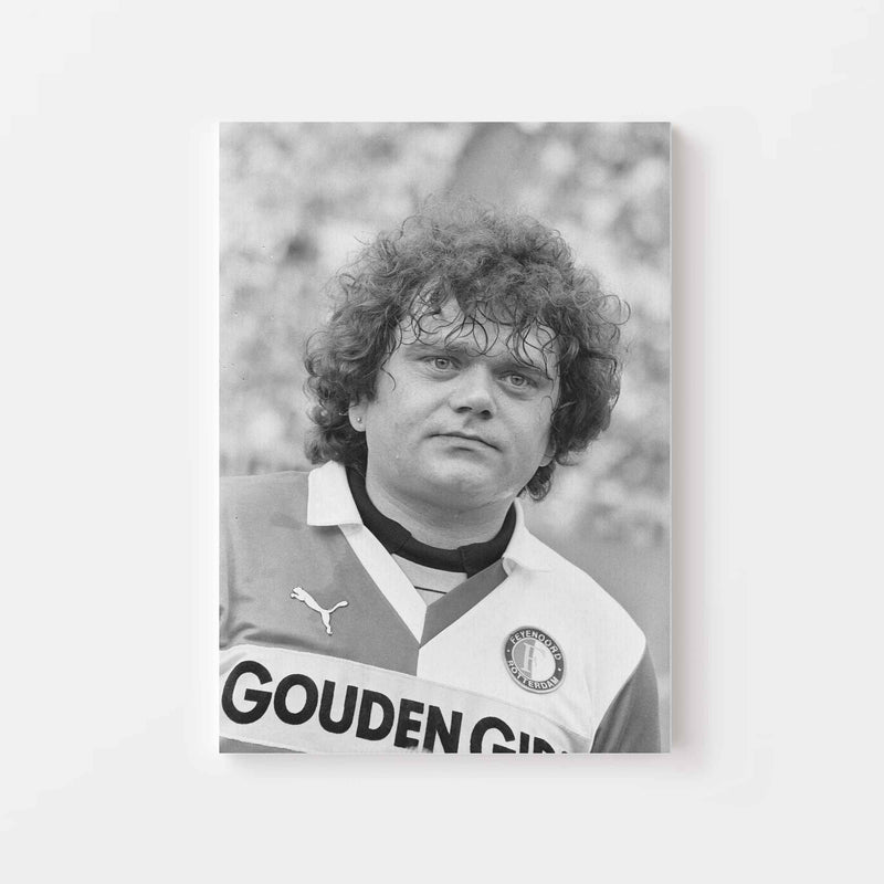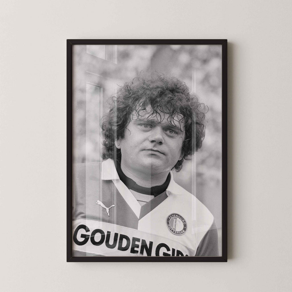 Breng een ode aan een legende met deze iconische zwart-wit poster van André Hazes in een klassiek Feyenoord-shirt. De afbeelding toont de Amsterdamse volkszanger met zijn kenmerkende krullen, in een retro Puma-shirt van Feyenoord Rotterdam met "Gouden Gids" als sponsor. Een uniek moment waarin muziek en voetbal samenkomen. Perfect voor fans van Hazes, Feyenoord of nostalgische voetbalcultuur.