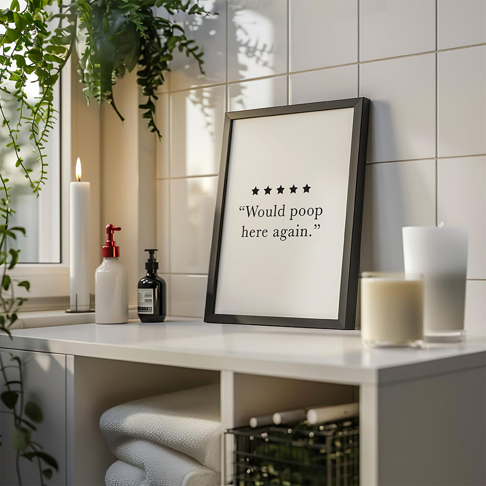 Geef je toilet of badkamer een hilarische upgrade met deze 5-sterren review poster! Dit humoristische ontwerp tovert gegarandeerd een lach op het gezicht van iedereen die even neerstrijkt op het kleinste kamertje. Of je nu gasten wilt laten lachen of gewoon zelf wat extra plezier aan je wc-ruimte wilt toevoegen, deze poster is dé perfecte keuze. Verkrijgbaar als poster, ingelijste poster, canvas of glasschilderij, zodat je altijd een stijl vindt die bij jouw interieur past.