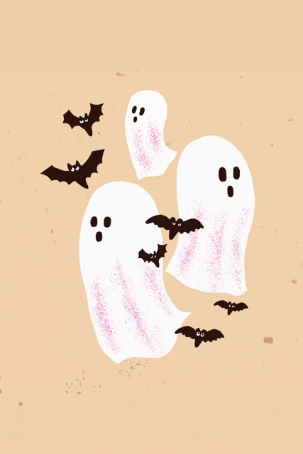 Licht, luchtig en precies spooky genoeg — de Halloween Ghosts and Bats Poster van Walljar brengt de perfecte Halloween vibe in huis! De poster toont drie schattige spookjes die zweven tussen nieuwsgierige vleermuizen, allemaal op een warme beige achtergrond met een subtiele vintage structuur. De roze accenten geven het geheel een speelse twist, waardoor deze print net zo goed in een modern als in een retro interieur past.