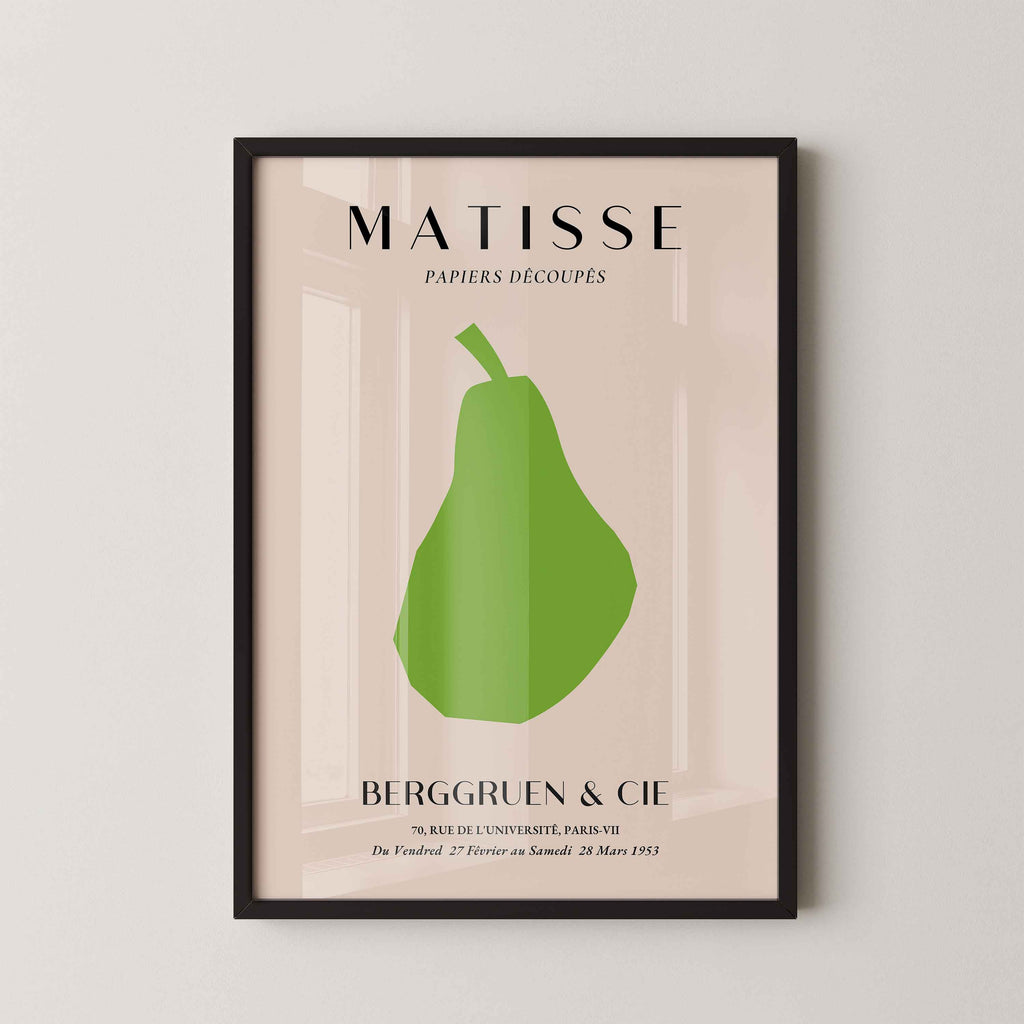 Geef je interieur een artistieke en minimalistische touch met deze Matisse-achtige Papiers Découpés poster met een peer. Het eenvoudige maar krachtige ontwerp in het groen op een neutrale achtergrond brengt een moderne, grafische look aan je muur. Geprint op 250 grams premium satin papier voor een luxe uitstraling en haarscherpe details – perfect voor liefhebbers van kunstposters en minimalistische wanddecoratie.