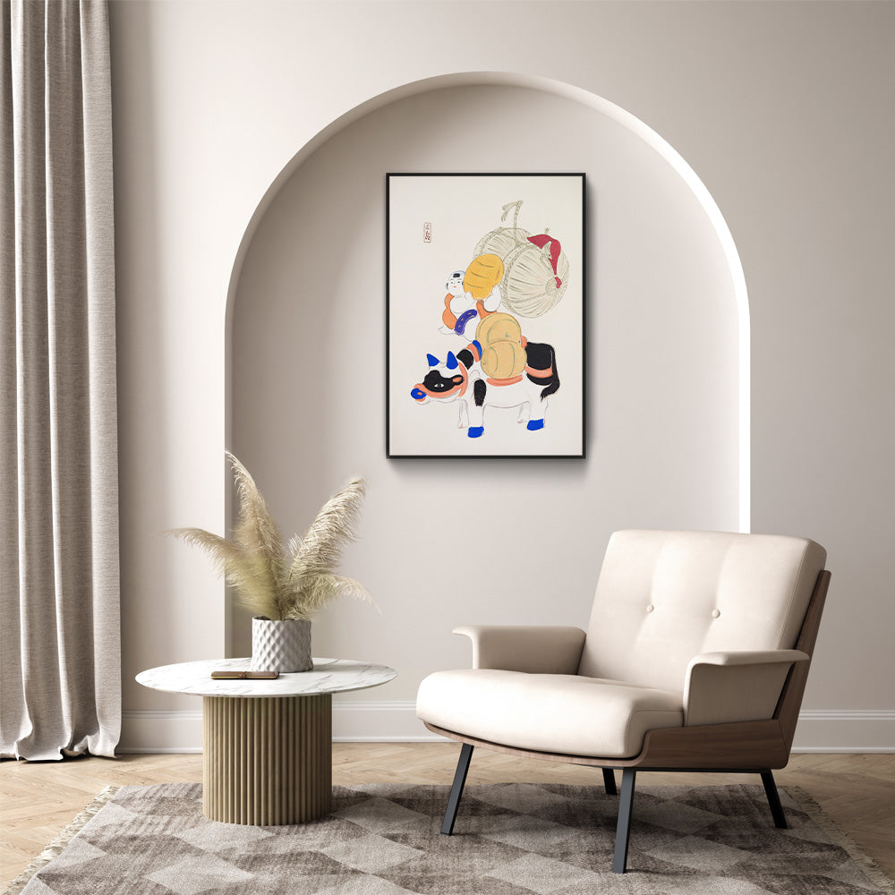 Deze karaktervolle Japanse vintage poster is een kunstwerk van Kawasaki Kyōsen, een bekende Japanse kunstenaar die aan het begin van de 20e eeuw traditionele Japanse speelgoedillustraties vastlegde. De illustratie toont een speels tafereel met een figuur op een os, beladen met bundels en objecten, uitgevoerd in zachte lijnen en subtiele maar krachtige kleuren.