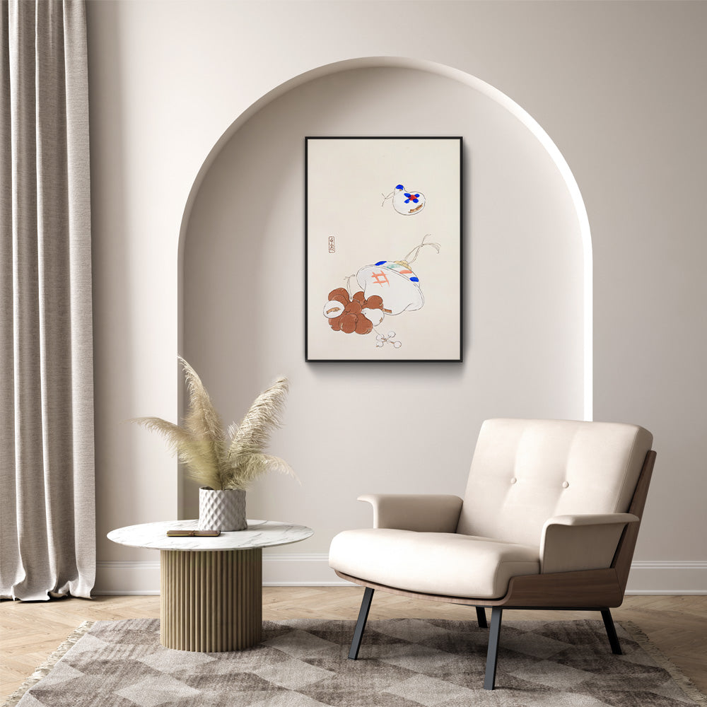 Deze Japanse vintage poster van Kawasaki Kyōsen toont traditioneel Japans speelgoed in een minimalistische en verfijnde compositie. De zachte lijnen, subtiele kleuren en ruime witvlakken geven het werk een rustige, bijna poëtische uitstraling. Een tijdloos kunstwerk dat perfect past binnen een Japandi, zen of minimalistisch interieur.