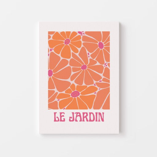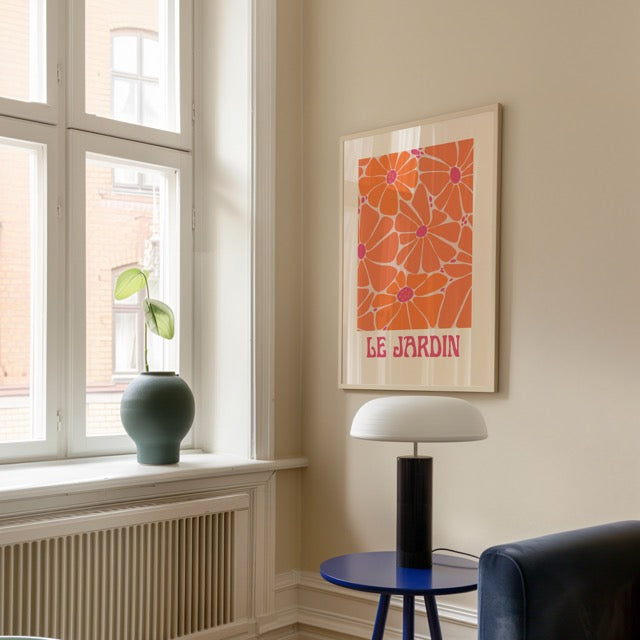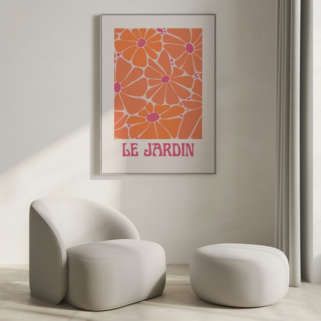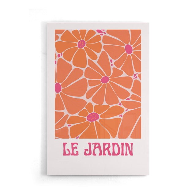 Breng een vleugje zomerse vrolijkheid in je interieur met de Le Jardin poster. Dit speelse ontwerp is een explosie van kleur, met feloranje bloemen en levendige roze accenten. De abstracte bloemenprint en de retro typografie geven deze poster een unieke, artistieke uitstraling die perfect past in een modern of boho interieur.
