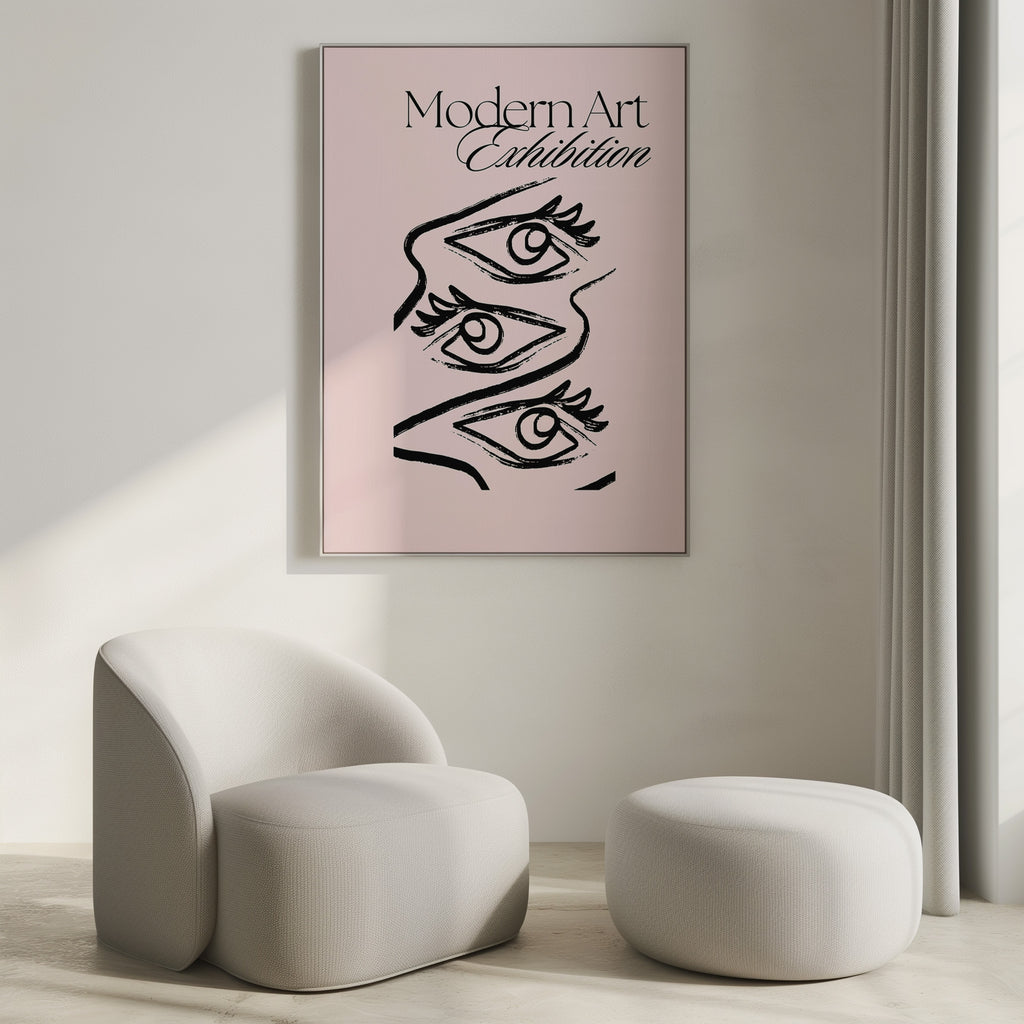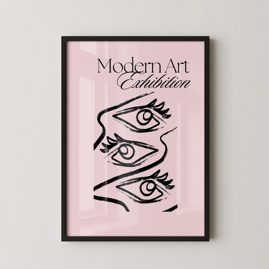 Breng een eigentijdse en artistieke sfeer in je interieur met deze stijlvolle Modern Art Exhibition poster. Het minimalistisch design in zwart-wit op een zachtroze achtergrond toont drie abstracte ogen in een vloeiende lijntekening, perfect voor liefhebbers van moderne kunst en grafische prints.Ideaal voor woonkamers, ateliers of creatieve werkplekken.