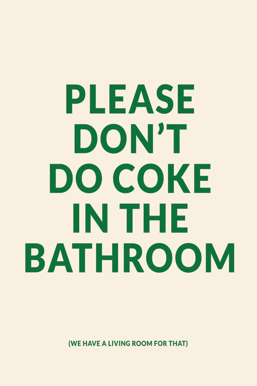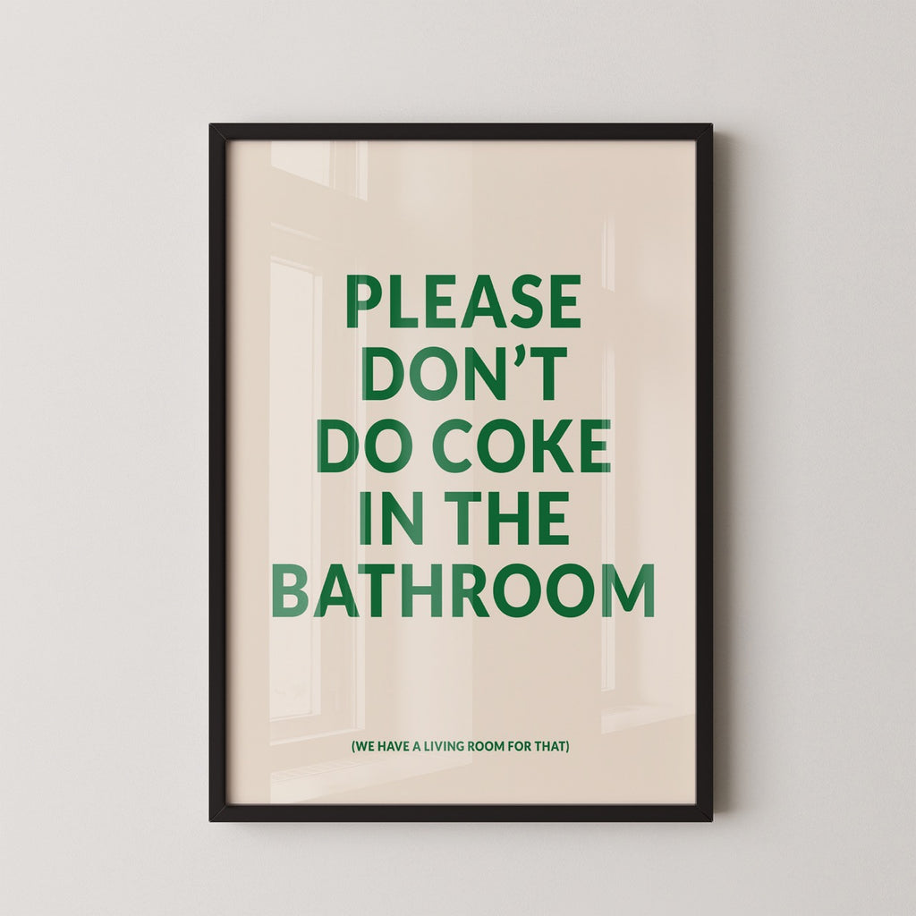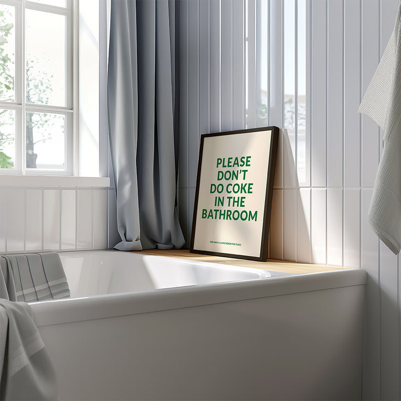 Geef je interieur een dosis humor met deze opvallende poster met de tekst: “Please Don’t Do Coke in the Bathroom (We have a living room for that)”.Ideaal voor in het toilet of de badkamer.Deze humoristische en brutale wanddecoratie zal ongetwijfeld een lach op je gasten maken.Een echte aantrekkingskracht voor mensen met een gevoel voor humor en een unieke inrichting.