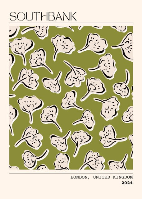 Voeg een trendy en grafische touch toe aan je interieur met deze Southbank London poster uit 2024. Het speelse patroon van abstracte bloemen in crème op een olijfgroene achtergrond geeft een moderne, creatieve uitstraling aan elke muur. Geprint op 250 grams premium satin papier voor een luxe afwerking en haarscherpe details – ideaal voor liefhebbers van eigentijdse wanddecoratie met een stedelijk tintje.