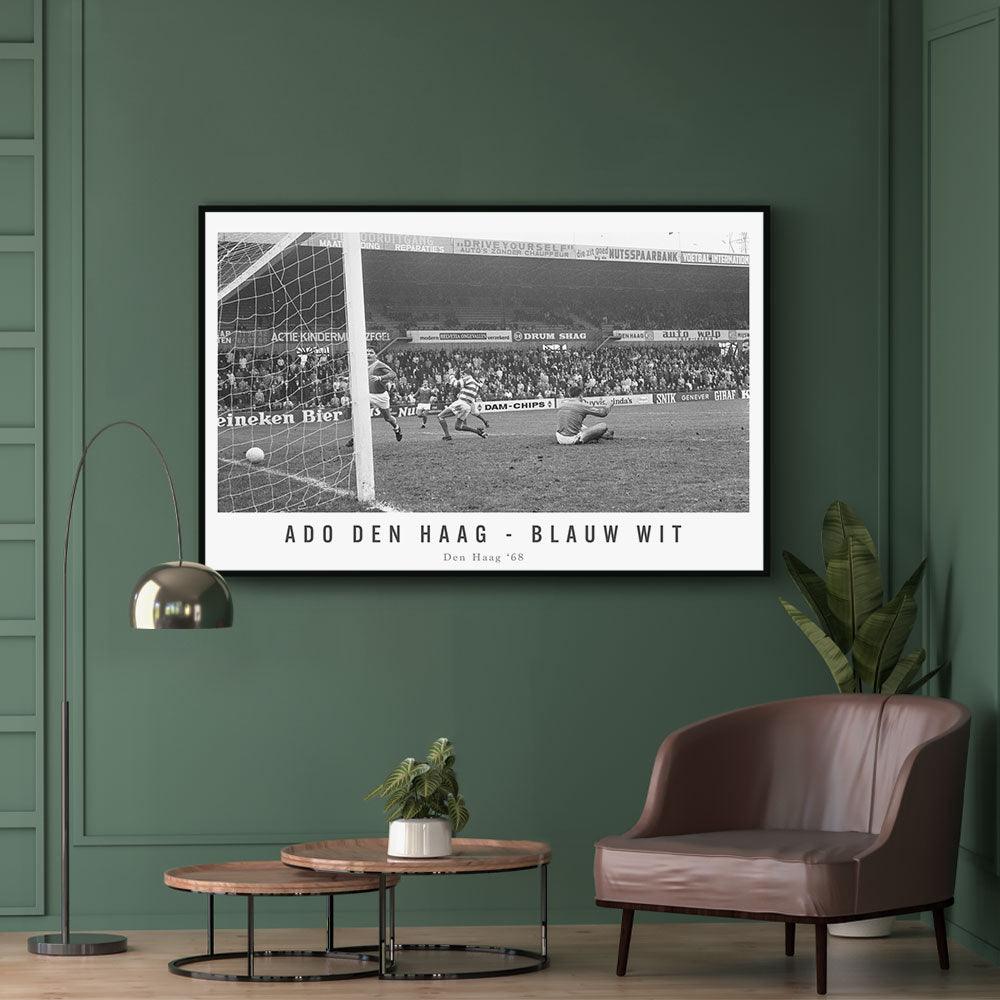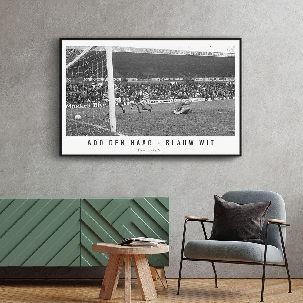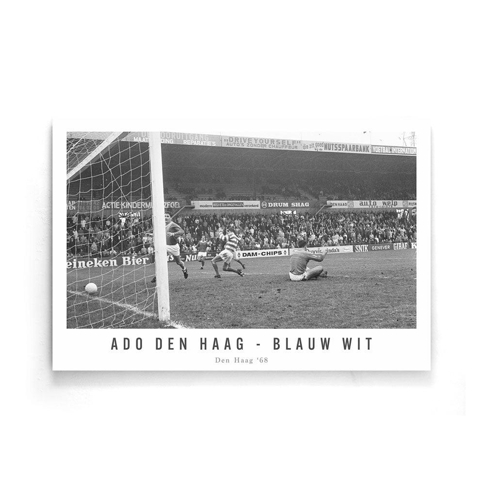 Op de foto zie je de bekerwedstrijd van ADO Den Haag - Blauw Wit 4-2.  Piet Giesen scoort in de verlenging voor ADO, rechts keeper Paternotte. Deze prachtige print geeft sfeer in jouw omgeving! Bestel je favoriete sport wanddecoratie en kies zelf de afmeting en het materiaal.