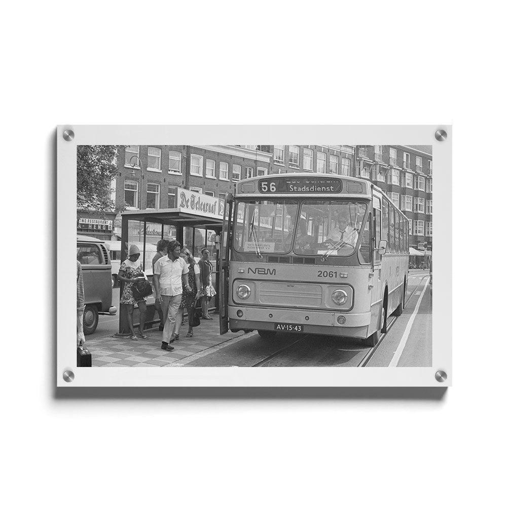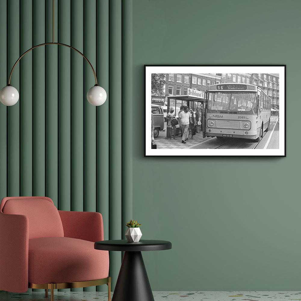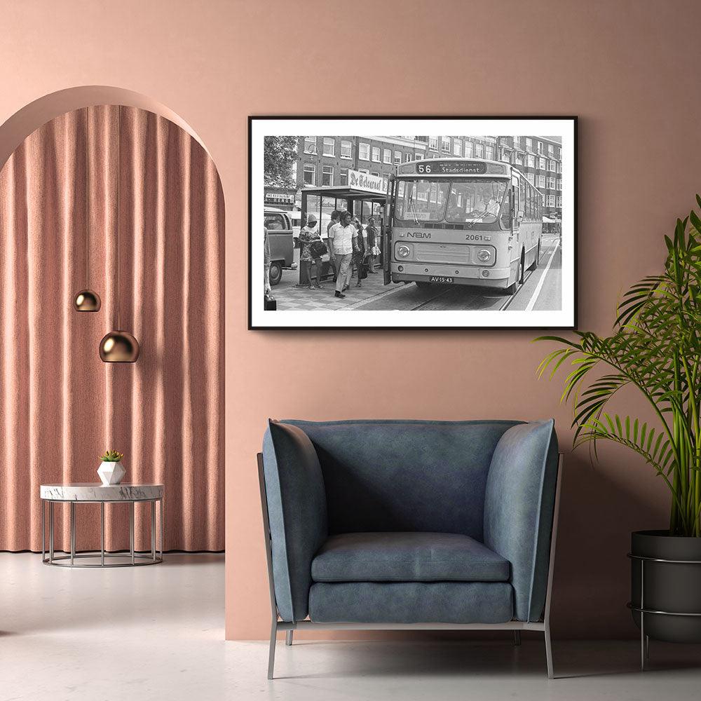 De zwart-witte stijl van deze print geeft een retro gevoel. Op de print zie je de NBM-stadsdienstenbuslijn 56 naar Bijlmer, bus bij de halte. Moderne fotokunst met een vintage uitstraling zorgt ervoor dat jouw muren er op hun best uitzien!