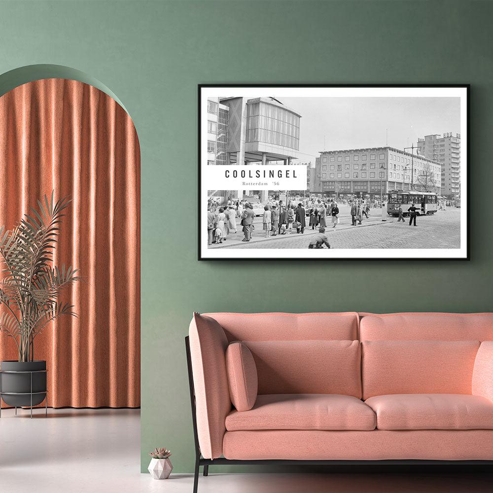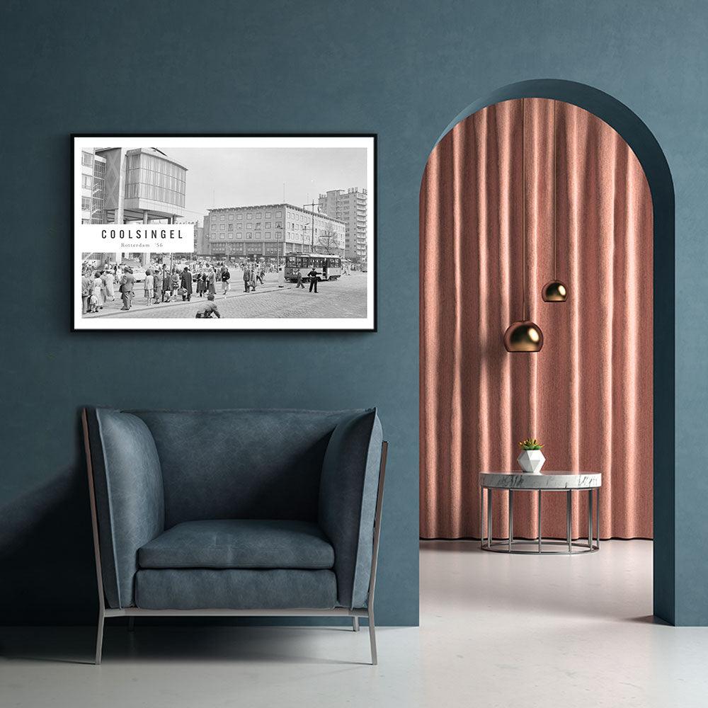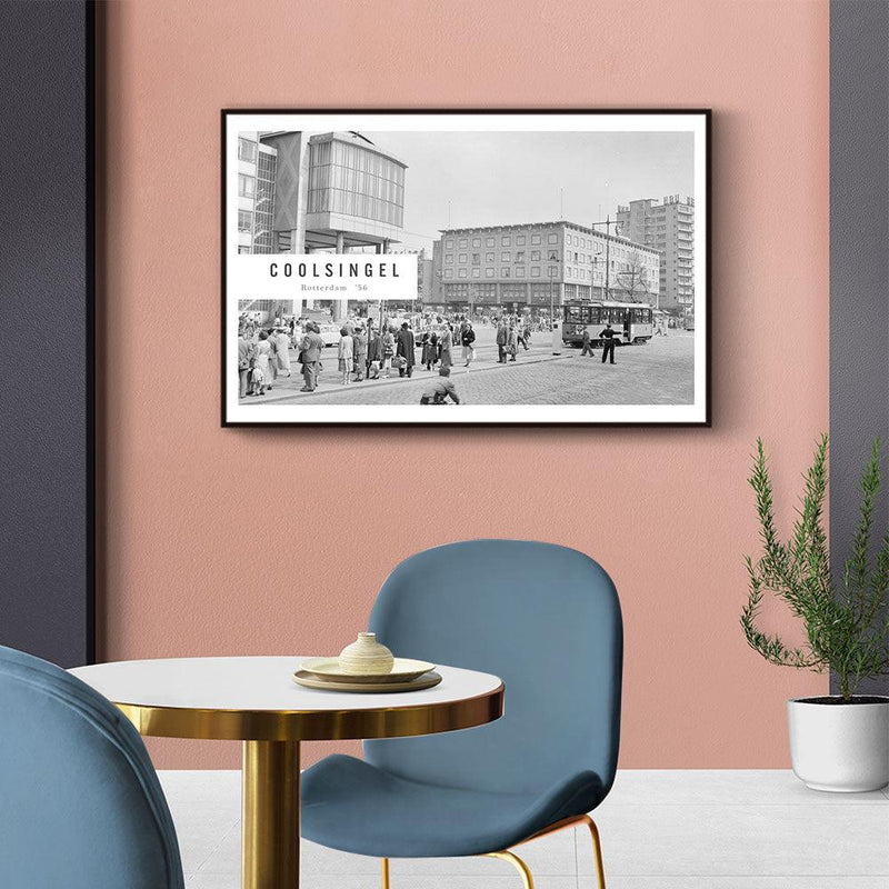 Op deze print zie je meerdere gebouwen gelegen aan de Coolsingel in Rotterdam. Op rechts zie je het Erasmushuis (HBU) en in het midden is het warenhuis de C&A te zien. Moderne fotokunst met een vintage uitstraling zorgt ervoor dat jouw muren er op hun best uitzien! Combineer dit design samen met de andere designs uit de Vintage Steden collectie.
