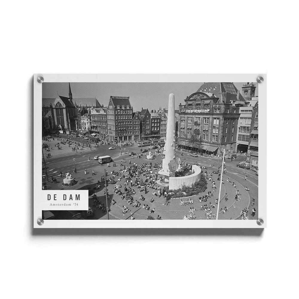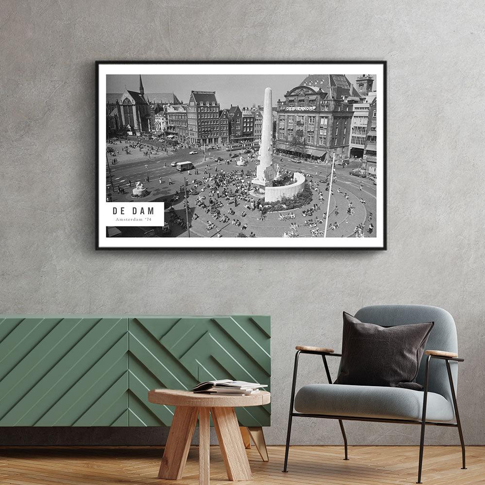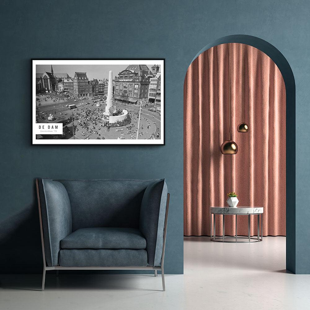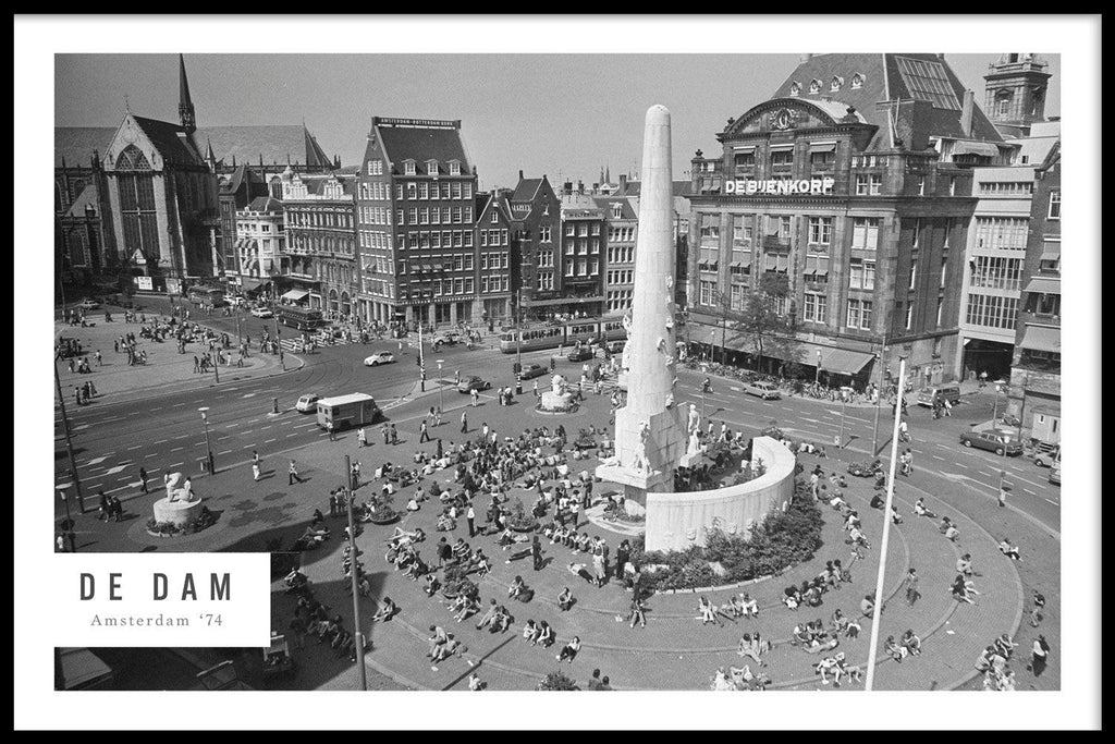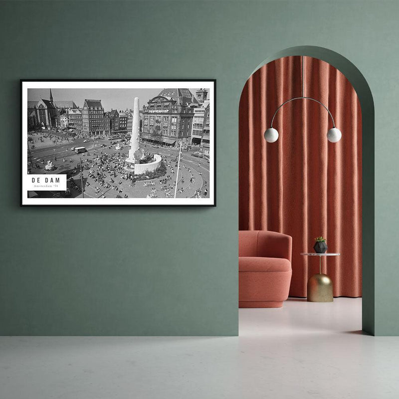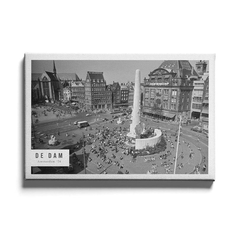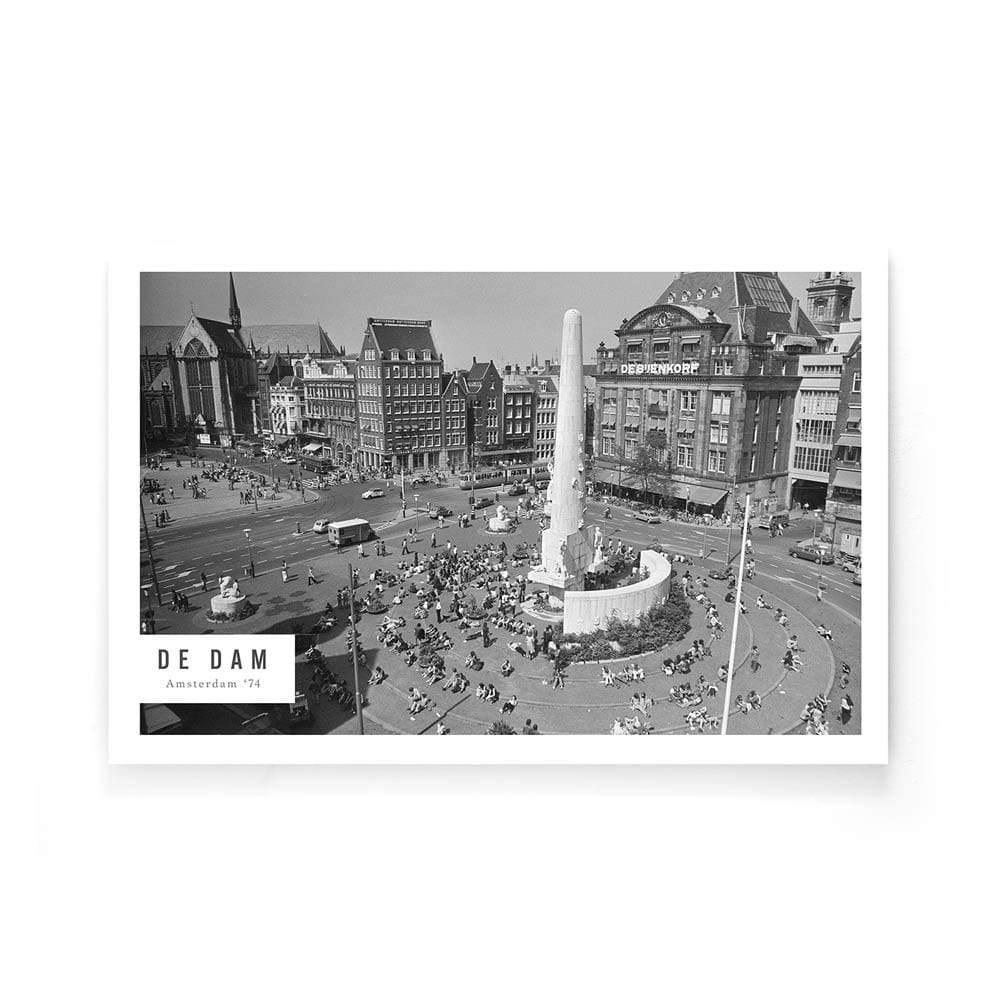 Op deze print zie je het overzicht van de Dam met het Nationaal Monument. Op rechts zie je het gebouw van het warenhuis de Bijenkorf. Op links zie je de Nieuwe Kerk aan de Dam. De zwart-witte stijl zal een retro gevoel geven aan jouw huis. Vind nu jouw favoriete stuk in onze Vintage Steden collectie!