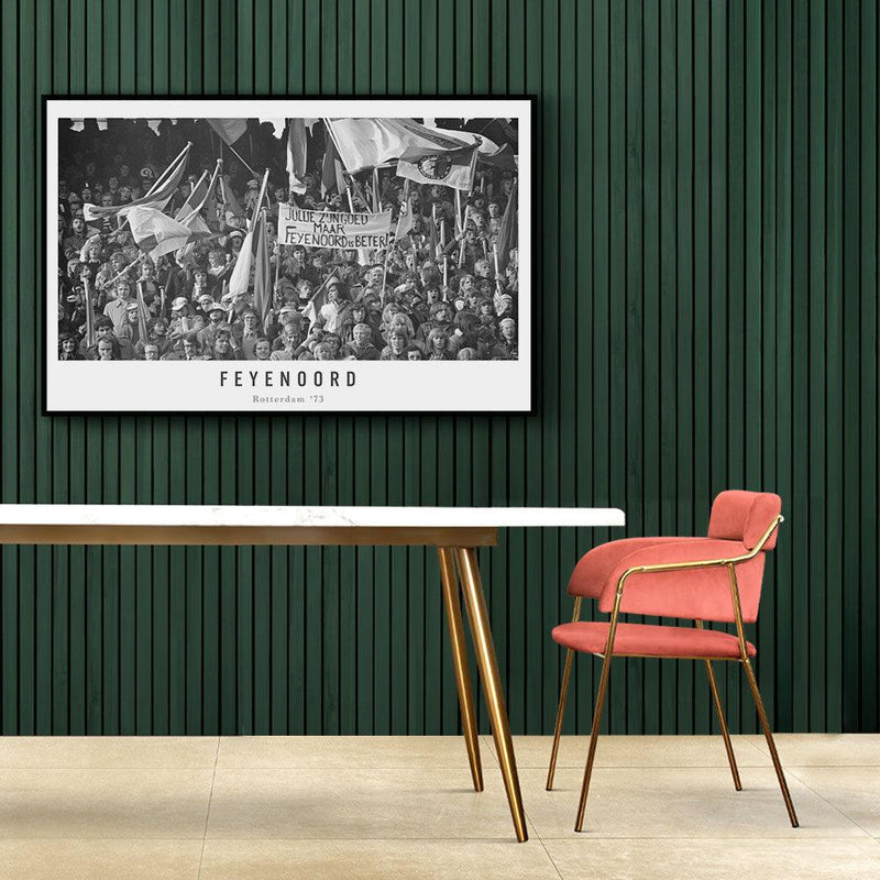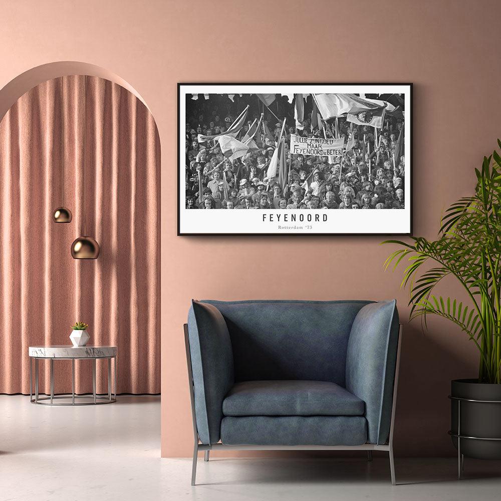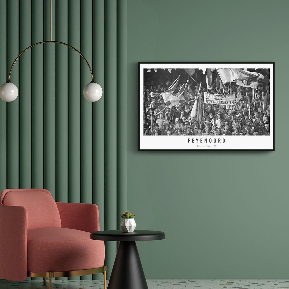 Op deze print zie je de Feyenoord supporters met vlaggen en spandoeken. Op een van de spandoeken staat: ''Jullie zijn goed, maar Feyenoord is beter!''. Dit was tijdens de wedstrijd Feyenoord tegen Sparta 4-0. Deze Eredivisie wedstrijd was er een op het thuisfront van Feyenoord in De Kuip in Rotterdam.