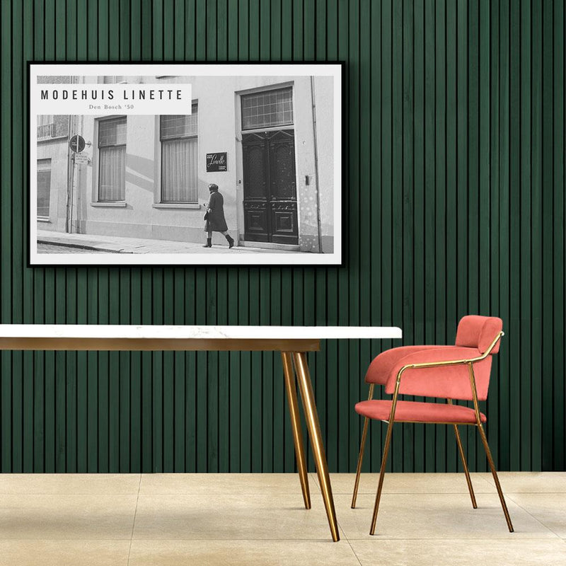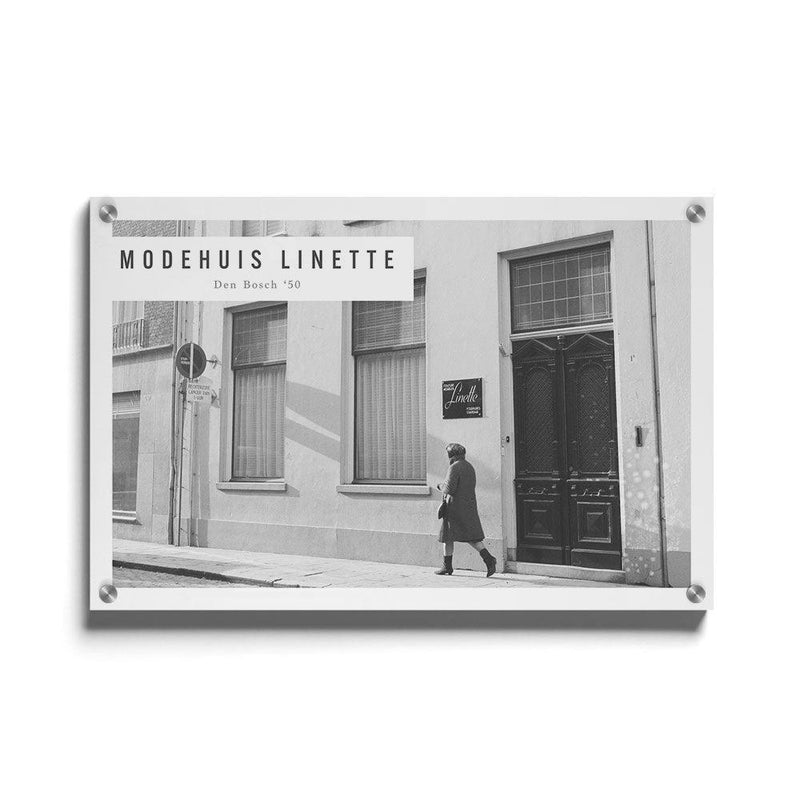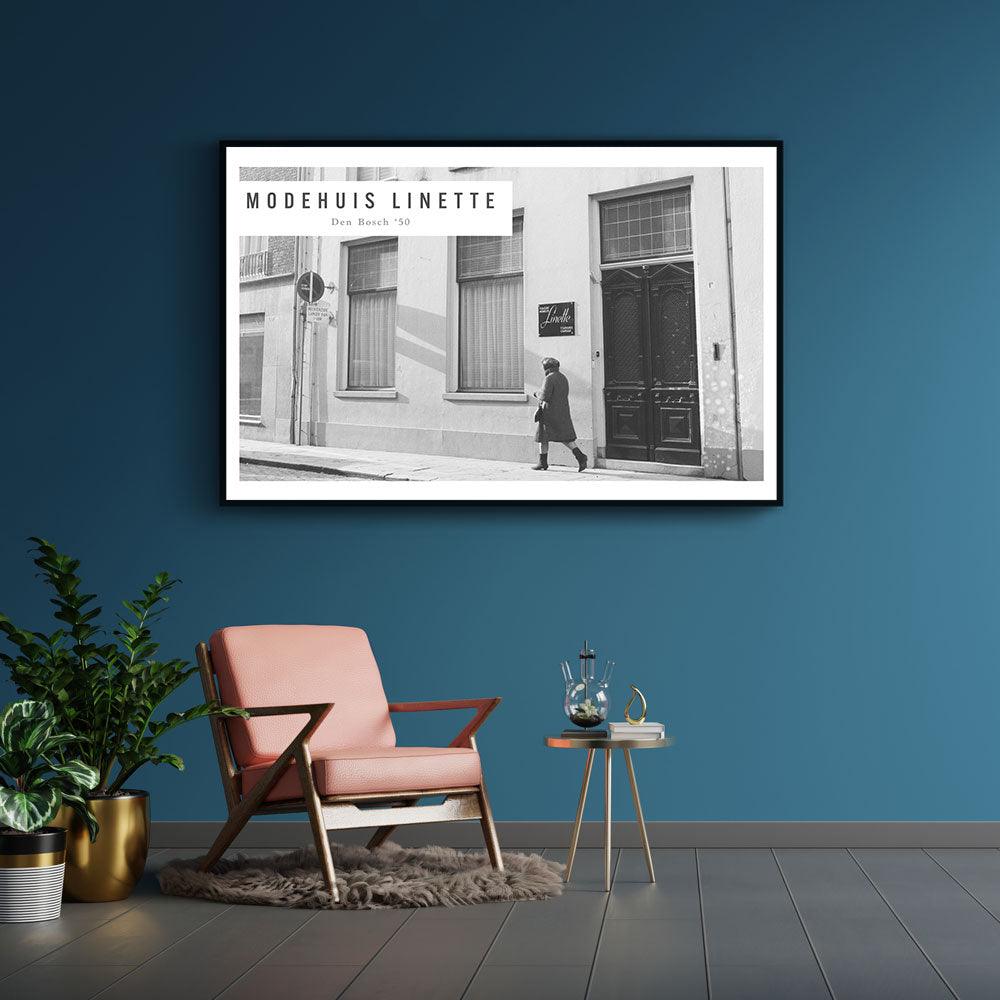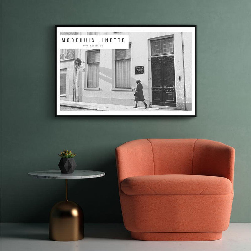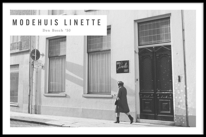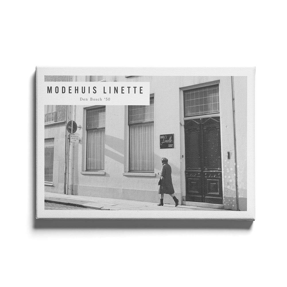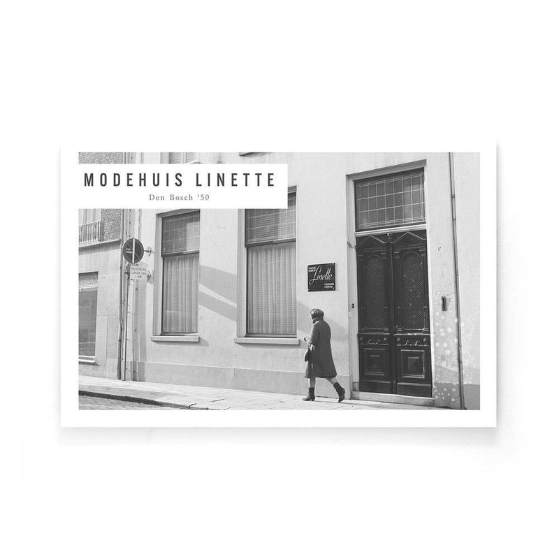 Op deze print zie je het modehuis Linette in Den Bosch. De ouders van Lien Bergé-Farwick, Clemens en Eugenie Farwick, hadden een modehuis met een couture-afdeling aan de Schapenmarkt 25 in ’s-Hertogenbosch. Deze zaak ging failliet waarna Linette zelf een modezaak begon: Maison Linette. Op deze zwart-witte print zie je het pand van het Modehuis en deze kan een klassieke uitstraling geven aan jouw woning.