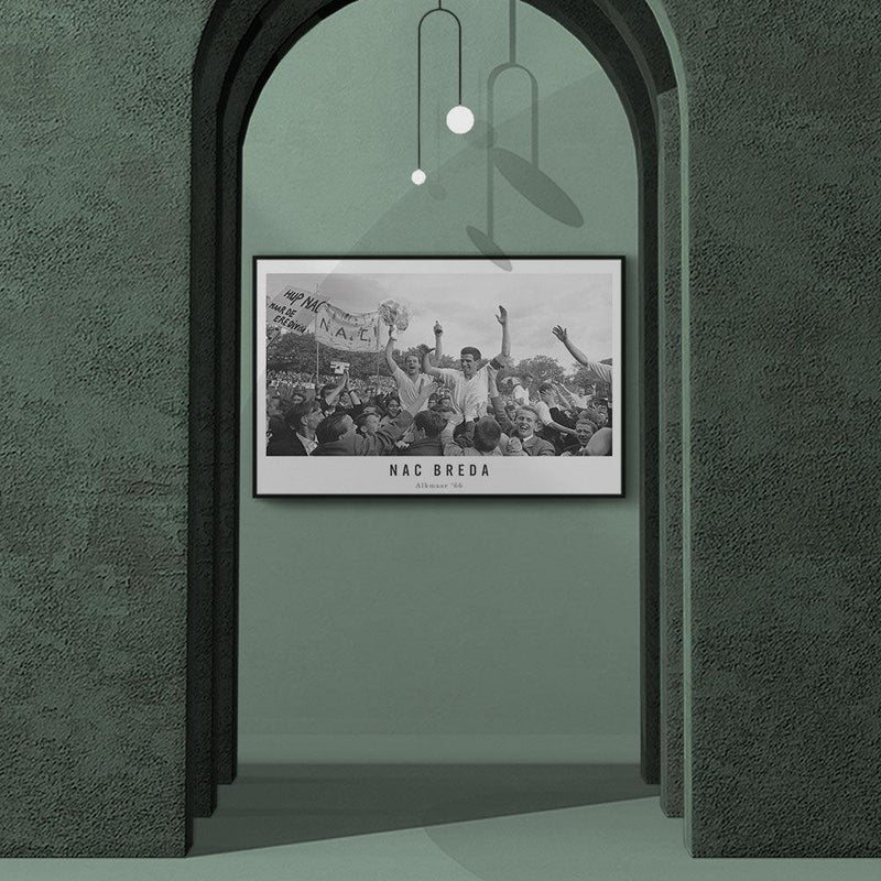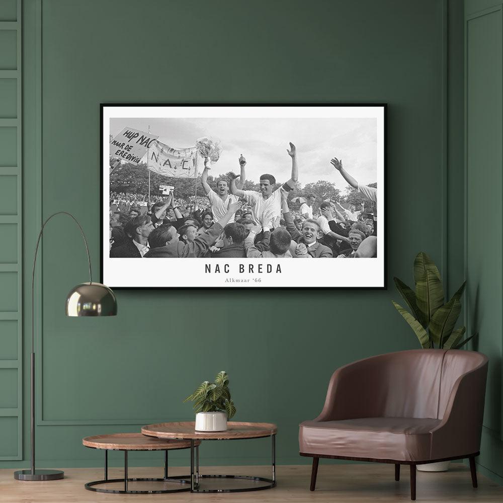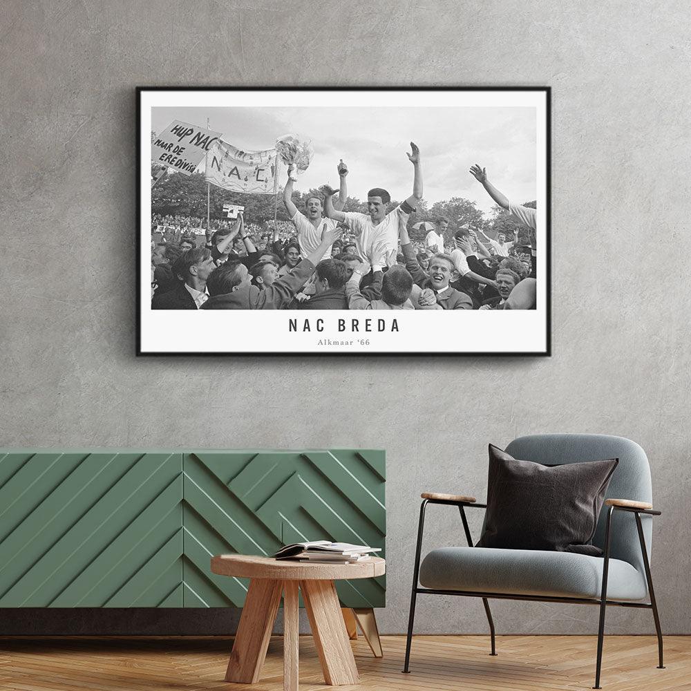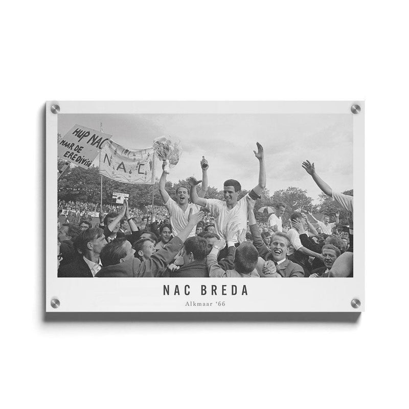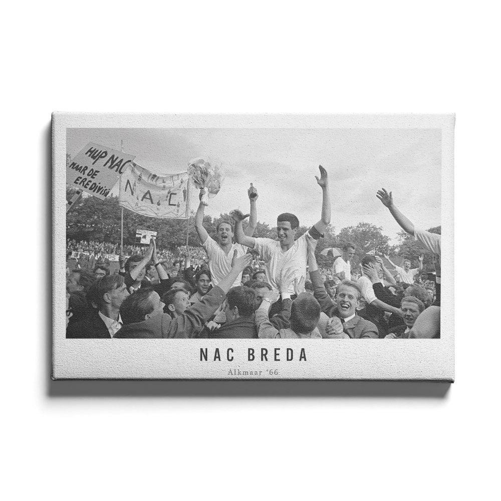 Op deze foto zie je de vreugde bij NAC spelers en supporters tijdens de Eerste divisie wedstrijd van Alkmaar tegen NAC Breda 0-3. NAC Breda promoveerde naar de Eredivisie. De wedstrijd werd gespeeld in het AFAS Stadion in Alkmaar. Op de print zie je dat de spelers van NAC Breda worden opgetild door de supporters.
