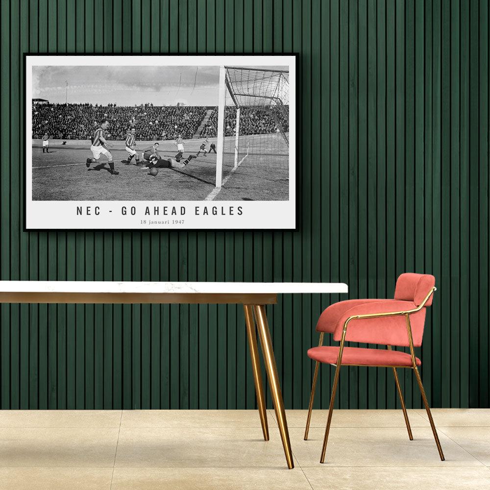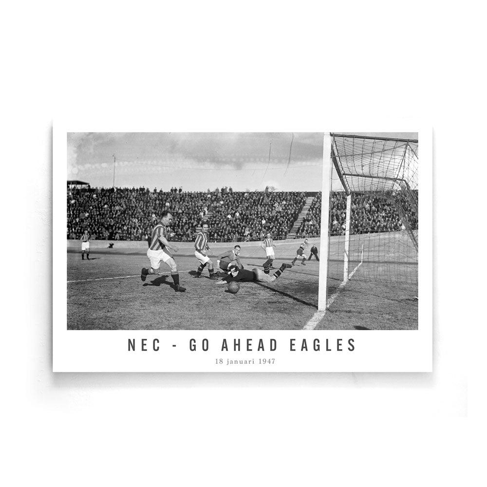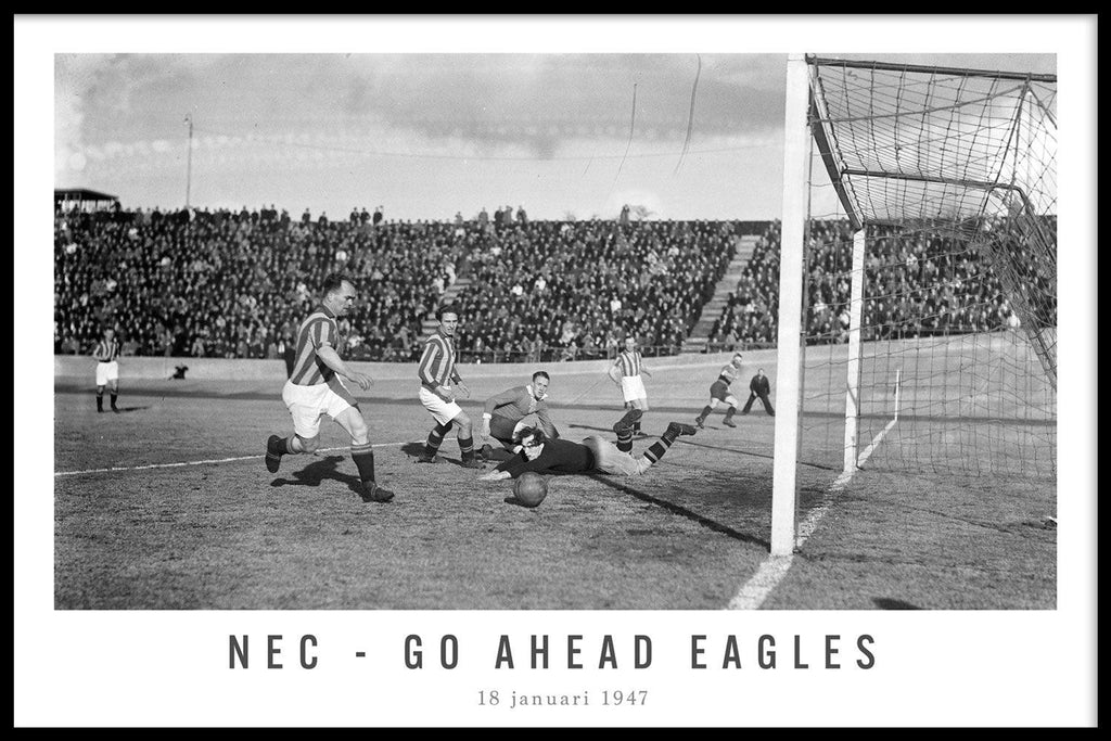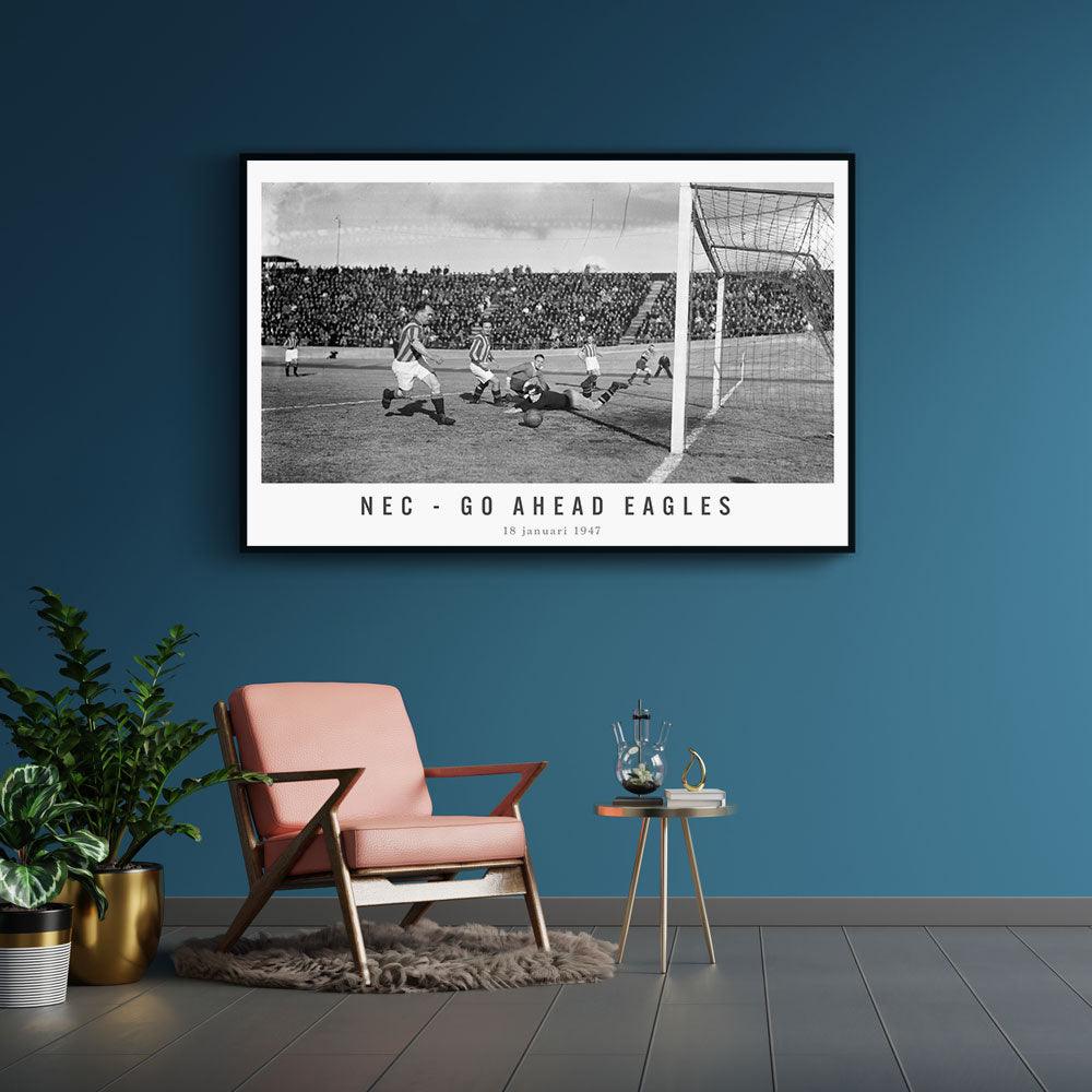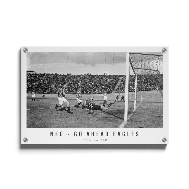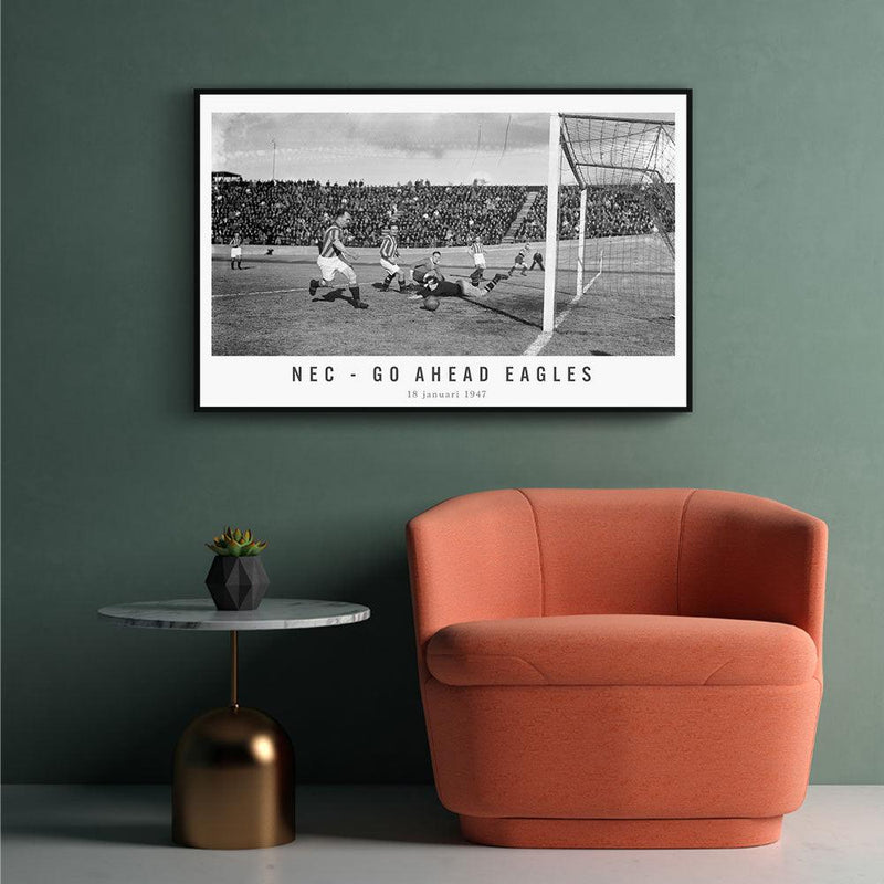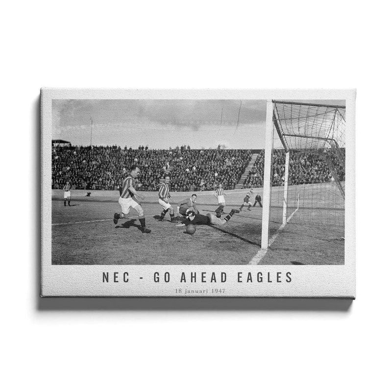 Bestel nu jouw vintage voetbal wanddecoratie bij Walljar! Vind hier de beste wedstrijden en spelmomenten op canvas geprint! Je ziet de kans van NEC met een schot dat voorlangs gaat. Je ziet ook de keeper van Go Ahead Eagles nog een uiterste poging doen om de bal te keren wat eindelijk niet nodig bleek te zijn. De wedstrijd werd in Nijmegen gespeeld en eindigde in een 1-1 remise. Deze wedstrijd was uiterst belangrijk omdat het een gevecht om de koppositie was. NEC werd dit seizoen uiteindelijk kampioen en Go Ahead Eagles tweede.