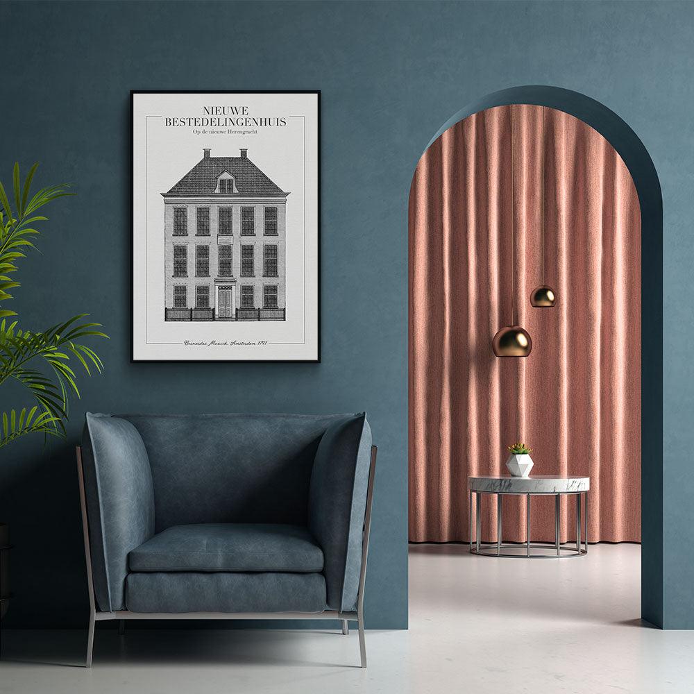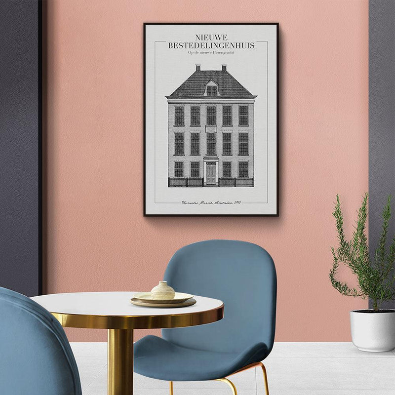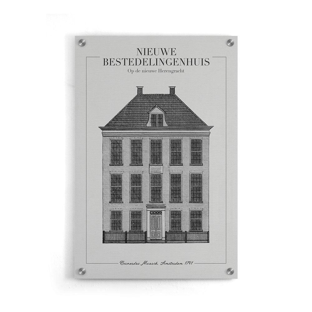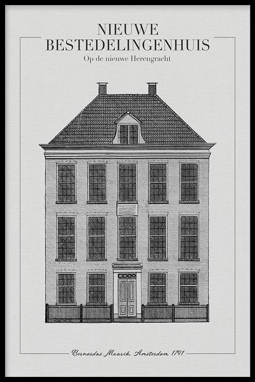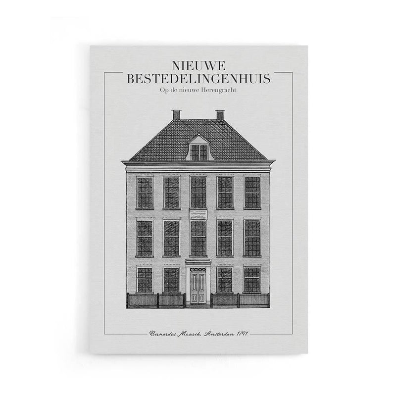 Het Voormalige Nederlandse Hervormde Diaconie Bestedelingenhuis is gesticht door Johanna van Mekeren. Het bestedelingenhuis is gebouwd in 1789. Tegenwoordig is het Bestedelingenhuis beter bekend als het Amstelrank op de nieuwe Herengracht in Amsterdam. Wil jij graag het nieuwe bestedelingenhuis bewonderen aan jouw muur? Dan zit je op de juiste plek! Wij bieden dit ontwerp aan op canvas, plexiglas en poster.