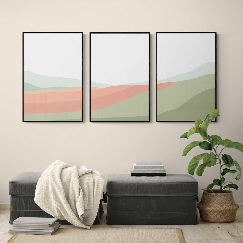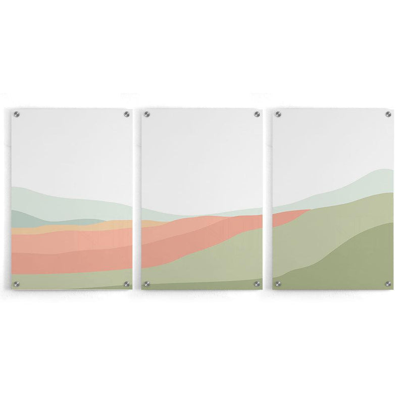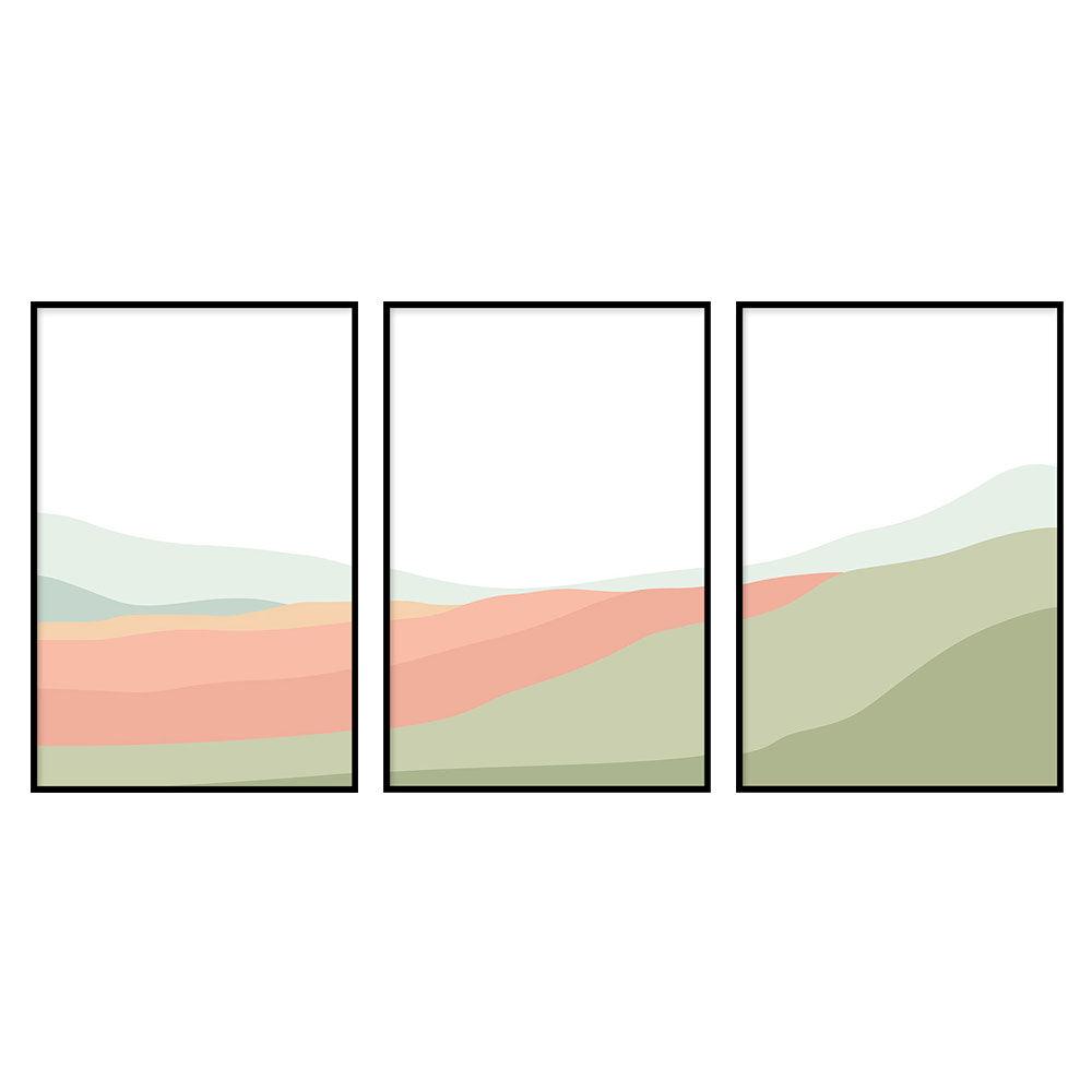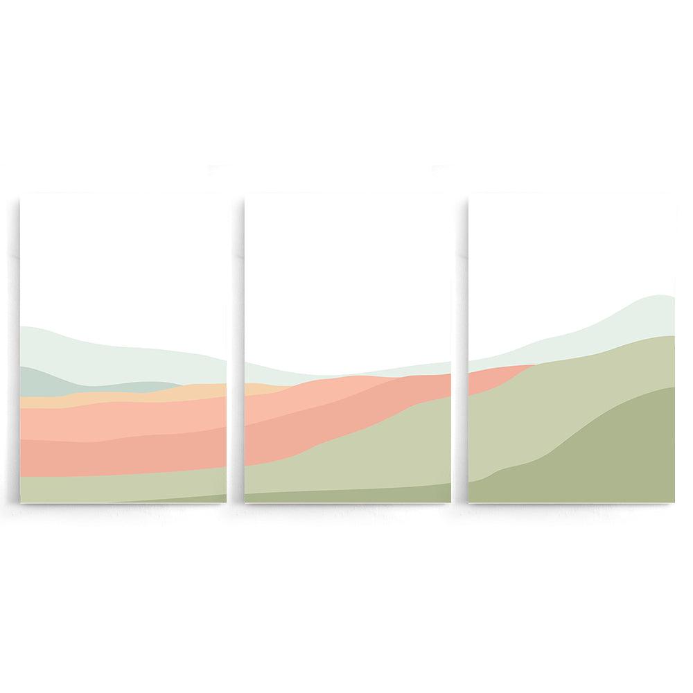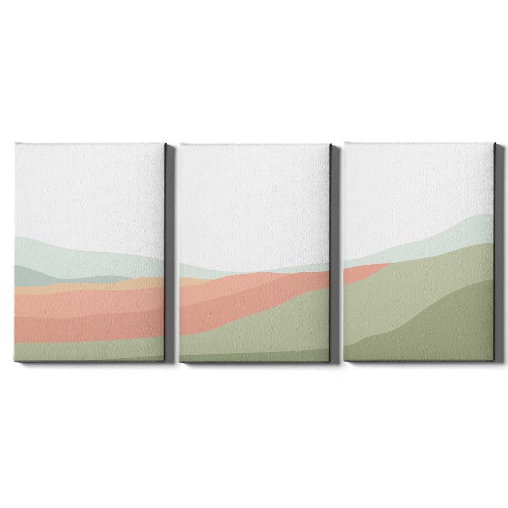 Pastel Landscape Een drieluik schilderij is een echte eyecatcher in jouw woonkamer of slaapkamer. Op dit design zie je een abstract drieluik schilderij dat lijkt op een digitaal berglandschap.