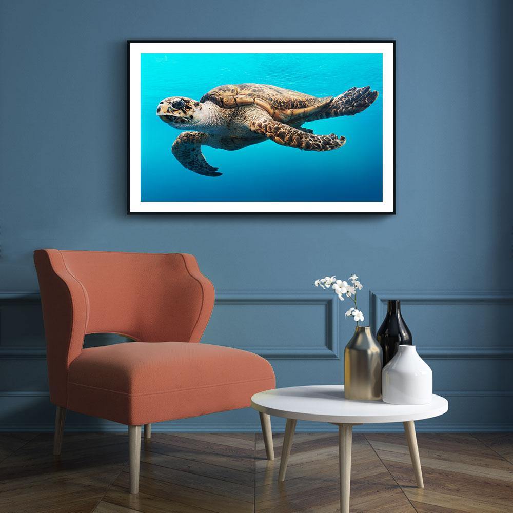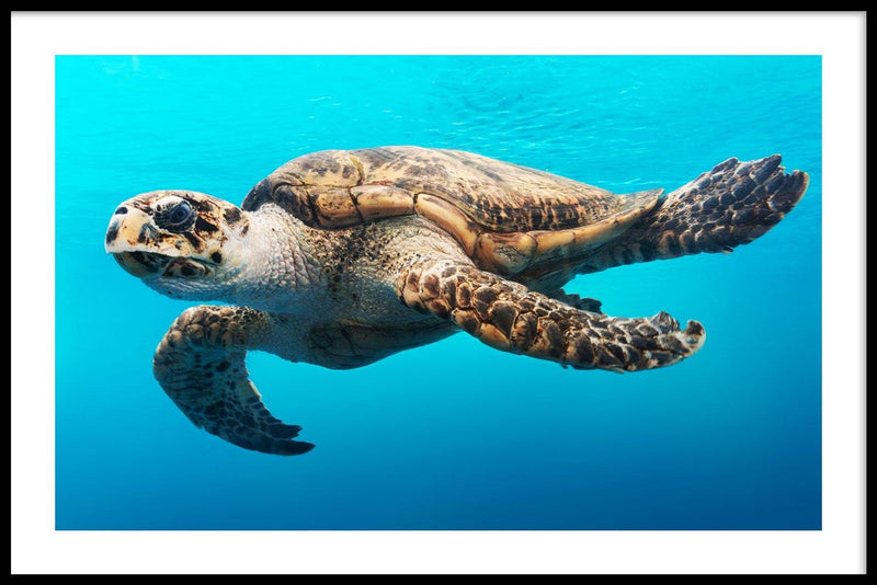 Ontsnap naar de serene diepten van de oceaan met onze prachtige print van een majestueuze schildpad. Dit kunstwerk vangt de rustige elegantie van de schildpad, zwevend door het kristalheldere water, omgeven door zachte golven van kleur. Het gedetailleerde ontwerp brengt de intrigerende textuur van het schild tot leven, met nuances van groen en bruin die harmonieus contrasteren met de blauwe tinten van de achtergrond.