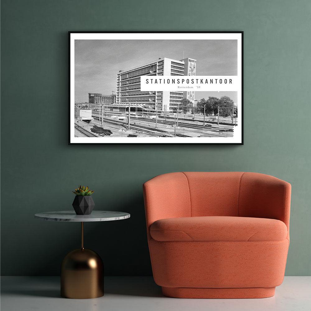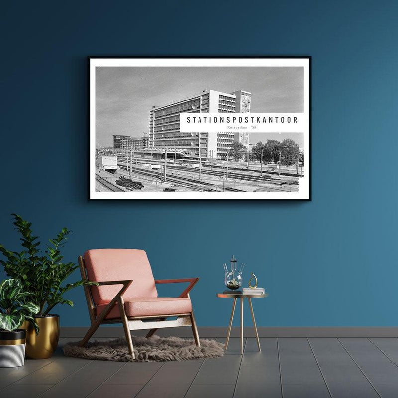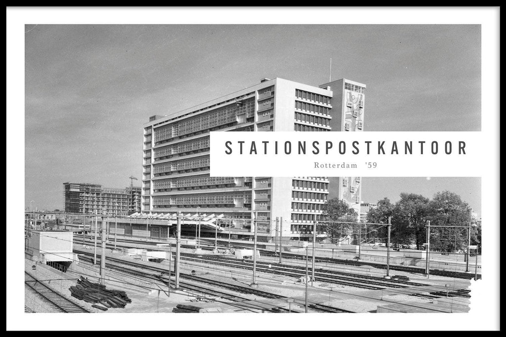 Op deze print zie je het net opgeleverde Stationspostkantoor in Rotterdam. In dit postkantoor zou alle briefpost en pakketpost worden ondergebracht. De PTT ontwikkelde dit gebouw als een postfabriek waarbij de aan- en afvoer zo volledig mogelijk gemechaniseerd werd. Het voormalig Stationspostkantoor in Rotterdam is nu een rijksmonument. Heb je interesse in vintage foto's? Vind nu jouw favoriete stuk in onze Vintage Steden collectie!